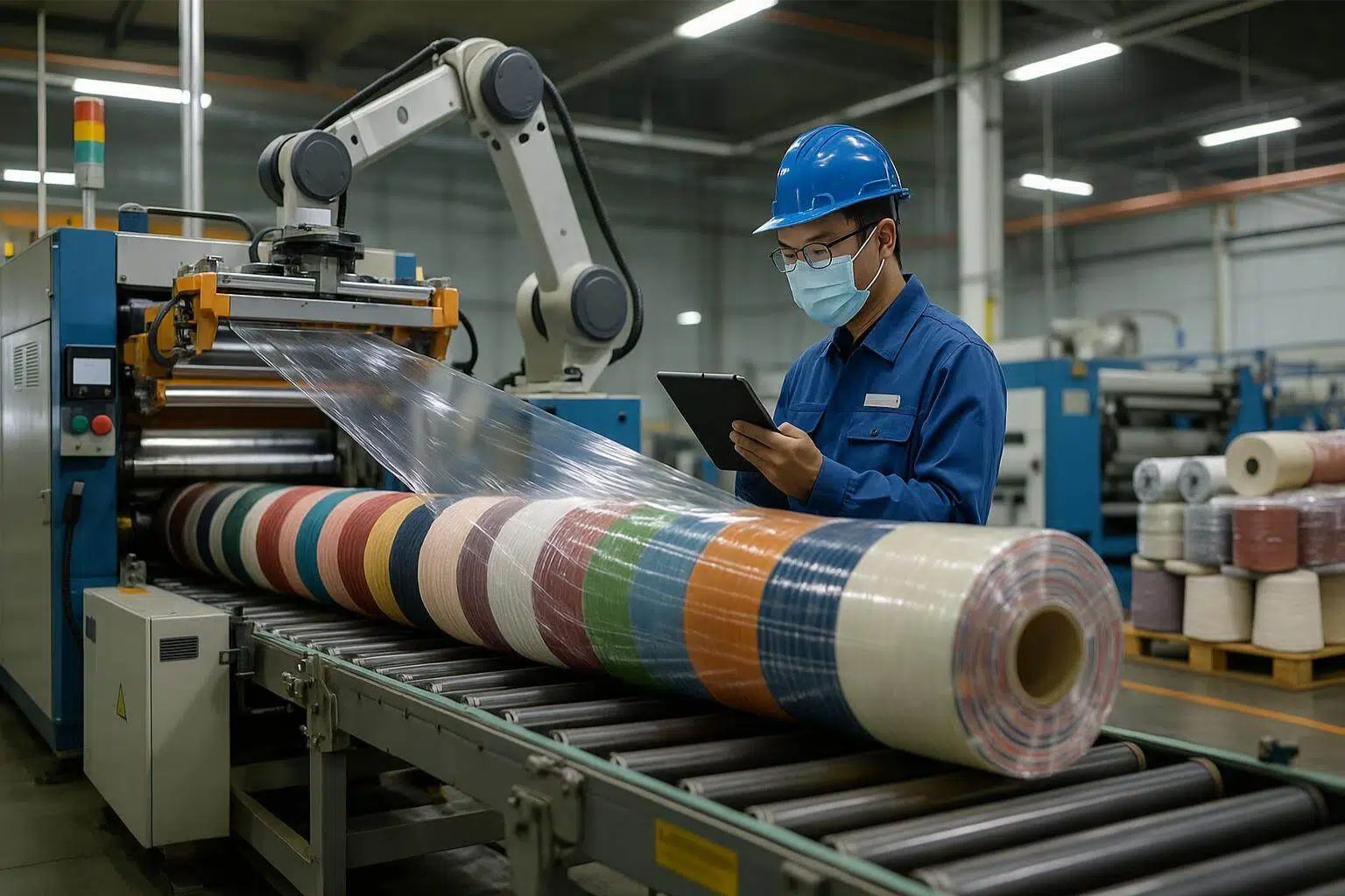 용융 단계 동안, 고전단 복합 기술 첨가제와 폴리에틸렌 기저재가 균일하게 혼합되어 인성과 내천공성이 크게 향상됩니다. 표면은 특수 처리되어 있습니다. 플라즈마 변형 공정 (코로나 처리)를 통해 접착제 잔류물 없이 자체 접착력을 최적화하여 고청결 산업의 엄격한 기준을 충족합니다. 완성된 롤은 일정한 장력 제어를 사용하여 감겨 늘어짐이나 변형을 방지하고 후속 공정에서 원활한 작동을 보장합니다.